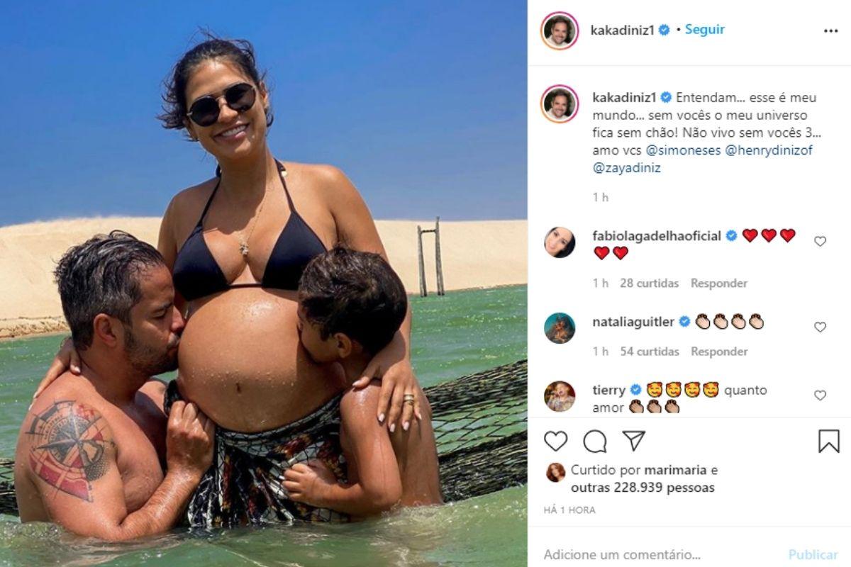 Na imagem, Kaká e Henry aparecem beijando a barriga de Simone, que sorri para as câmeras. “Entendam… Esse é meu mundo… Sem vocês o meu universo fica sem chão! Não vivo sem vocês três… Amo vocês, Simone, Henry e Zaya”, declarou o empresário na legenda da publicação.