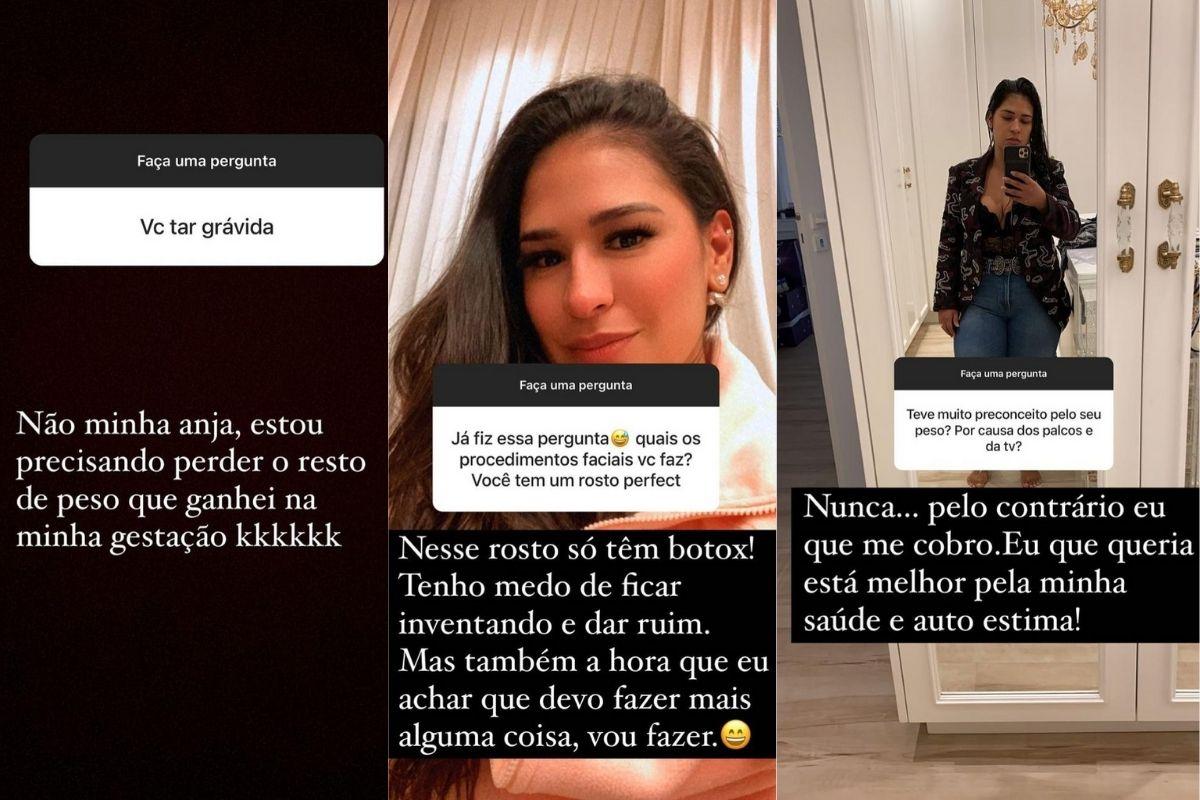 Questionada se está grávida, a cantora explicou: “Não minha anja! Estou precisando perder o resto do peso que ganhei com a minha gestação“, afirmou ela, que ainda respondeu se já sofreu preconceito por causa do corpo: “Nunca, pelo contrário, eu que me cobro. Eu que quero estar melhor pela minha saúde e autoestima”, garantiu.