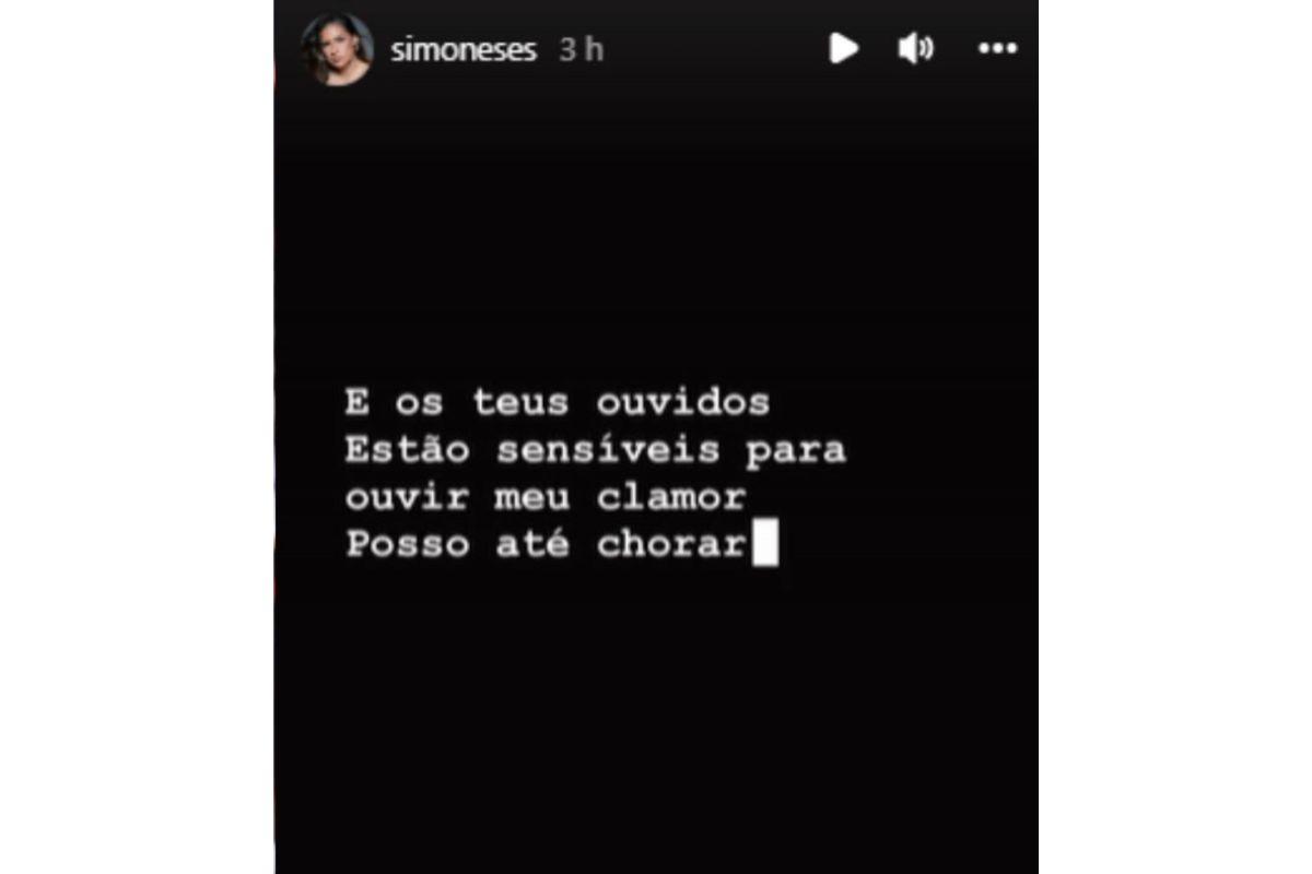 Foi em uma entrevista para a coluna do jornalista Leo Dias que Simaria contou que se sentia recriminada pela irmã. “Foi meu grito de socorro. Em tudo o que vou fazer, sou recriminada pela Simone. Você tem noção do que é passar 20 e tantos anos da sua vida sendo mandada calar a boca e não ser você mesmo? Você é você mesmo? Eu não tenho vergonha de falar a verdade”.