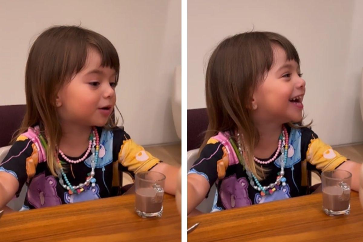 “Eu queria comer papinha de chocolate e minha mãe não deixou. Aí quando eu era bebê eu comi”, começou ela, caindo na risada. “A minha mãe falou assim: ‘Nossa, você está comendo papinha de chocolate? Não pode! Papinha de M&M você tem que comer’. A mamãe falou: ‘Não, é muito caro’”, completou a menina, fazendo a avó cair na risada.