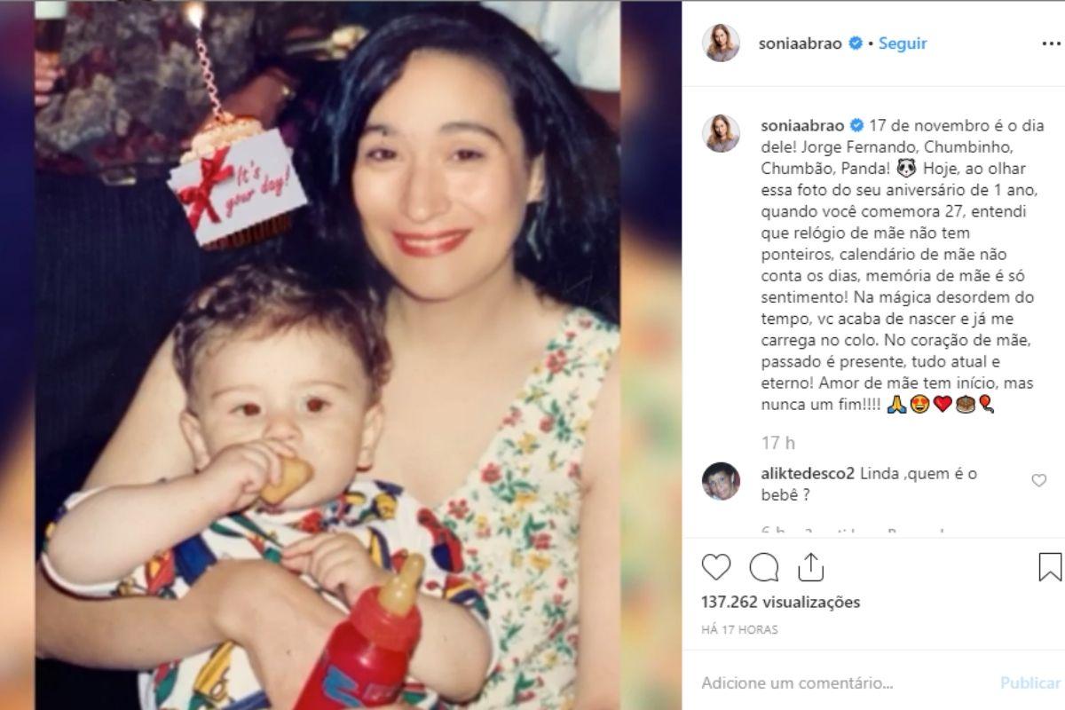 Sonia Abrão, mãe de Jorge Fernando Damião, usou as redes sociais para mostrar o quanto o amor de mãe não passa com o tempo. E que, por mais que os filhos cresçam… eles sempre serão um bebê. Tanto que ela comemorou os 27 anos do filho com uma foto de quando ele ainda tinha 1.