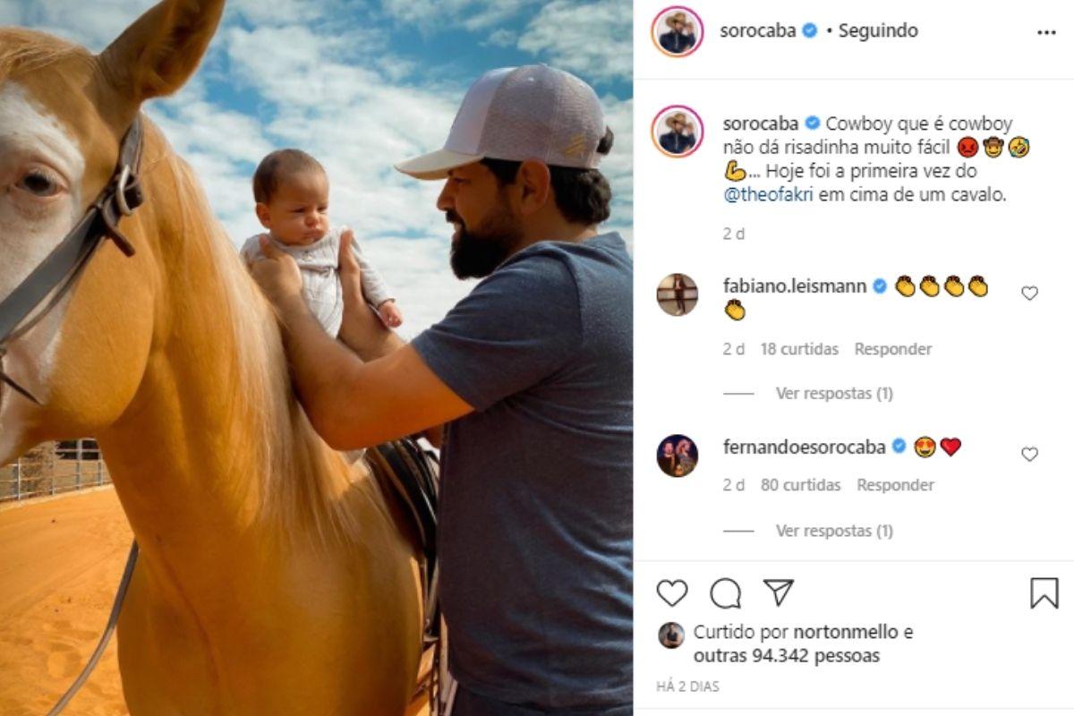 O cantor Sorocaba chamou atenção dos seguidores ao compartilhar uma foto do filho Théo, de 2 meses, em cima de um cavalo. Ao compartilhar a imagem, o cantor contou que era a primeira vez que o bebê, fruto do relacionamento com a influenciadora digital Biah Rodrigues, subiu em um cavalo. “Cowboy que é cowboy não dá risadinha muito fácil hehehe… Hoje foi a primeira vez do Théo em cima de um cavalo”, escreveu junto à foto, brincando com a cara séria do bebê na imagem.