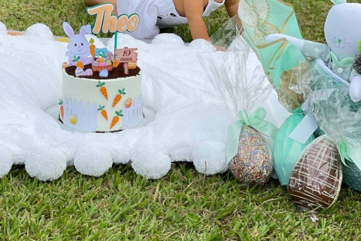 Junto com as fotos, a modelo fez uma singela declaração ao filho. “10 meses do nosso Theozinho, Que Deus te cubra de bençãos sem medidas meu filhotinho”, escreveu ela ao compartilhar as imagens. Na foto, a família aparece sentado próximo a uma toalha em um vasto campo, junto com um bolo temático de páscoa.