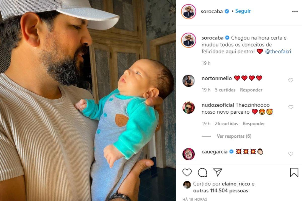 O cantor Sorocaba encantou os seguidores ao compartilhar uma foto com o filho, Théo, de um mês, no colo. Na imagem, o bebê, fruto do relacionamento com a influenciadora digital Biah Rodrigues, aparece olhando para o pai. Junto com a foto, o cantor fez uma homenagem ao filho e falou sobre a felicidade de tê-lo na família. “Chegou na hora certa e mudou todos os conceitos de felicidade aqui dentro!”, escreveu.