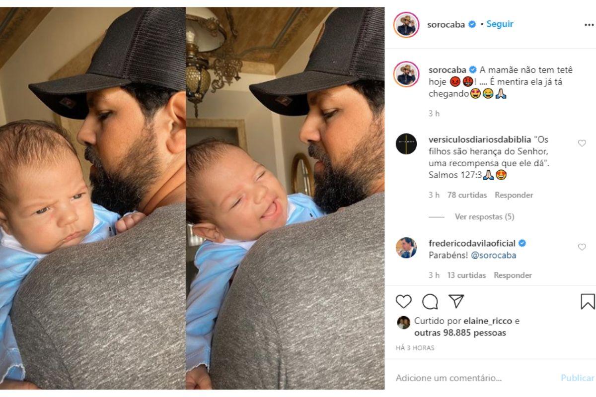 O cantor Sorocaba usou as redes sociais para compartilhar um momento lindo com o filho, Théo, de um mês. O famoso compartilhou uma montagem com duas fotos do bebê no colo dele. Em uma das imagens, o menino aparece com uma feição mais séria. Já na outra, Théo está dando uma gargalhada daquelas que dá orgulho de ver. “A mamãe não tem tetê hoje! …. É mentira ela já tá chegando”, escreveu Sorocaba na legenda, brincando.