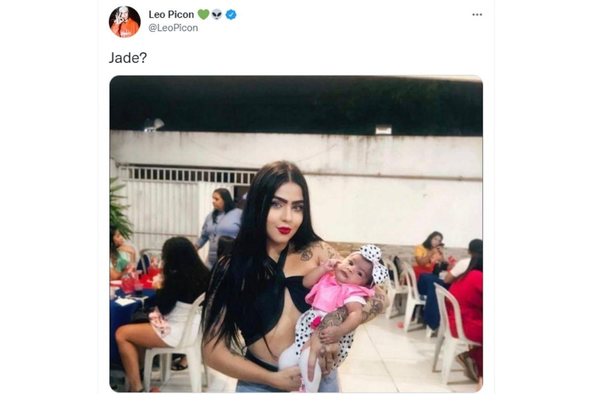 O empresário ficou surpreso ao ver Alice e compartilhou no Twitter pessoal uma foto em que ela aparece com um bebê no colo. Na legenda, brincou justamente sobre essa semelhança. “Jade?”, escreveu ele, ao publicar a foto.