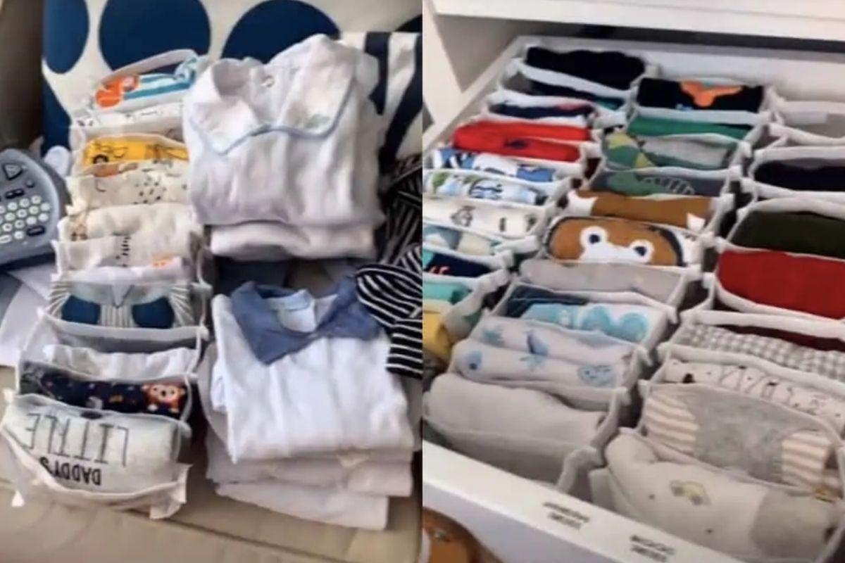 Depois, ao mostrar a organização que está fazendo, a atriz contou que o bebê está atualmente usando as roupas de 3 meses, mas revelou que falta pouco pra ele chegar nas de 6 meses e disse que “o bichinho está comprido”.