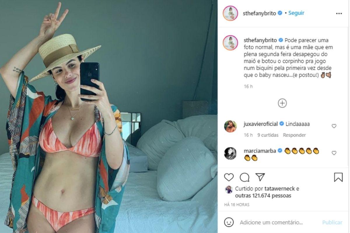 “Pode parecer uma foto normal, mas é uma mãe que em plena segunda feira desapegou do maiô e botou o corpinho pra jogo num biquíni pela primeira vez desde que o baby nasceu…(e postou!)”, escreveu Sthefany na legenda da publicação.