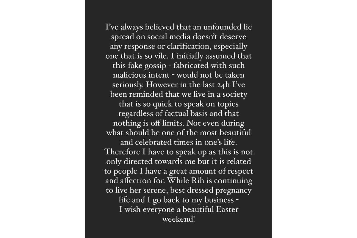 Ela finalizou: “Então, preciso, uma vez que esse assunto não é apenas direcionado a mim, mas afeta pessoas pelas quais tenho um grande respeito e carinho. Enquanto Rih etá vivendo sua gravidez serena e bem vestida, eu vou voltar para os meus negócios. Desejo a todos um bom feriado de Páscoa”.