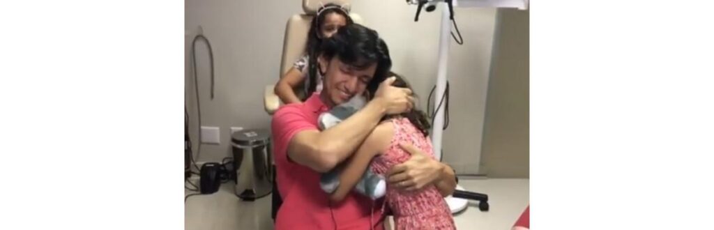 E no dia 17 de novembro aconteceu a magia: ele fez a ativação e conseguiu ouvir os barulhos logo nesse primeiro dia. Quando ouviu a voz da filha Maria Eduarda, não deu outra, a emoção tomou conta de todo mundo que estava presente: sua mulher, as filhas, o pai, a mãe e a esposa!