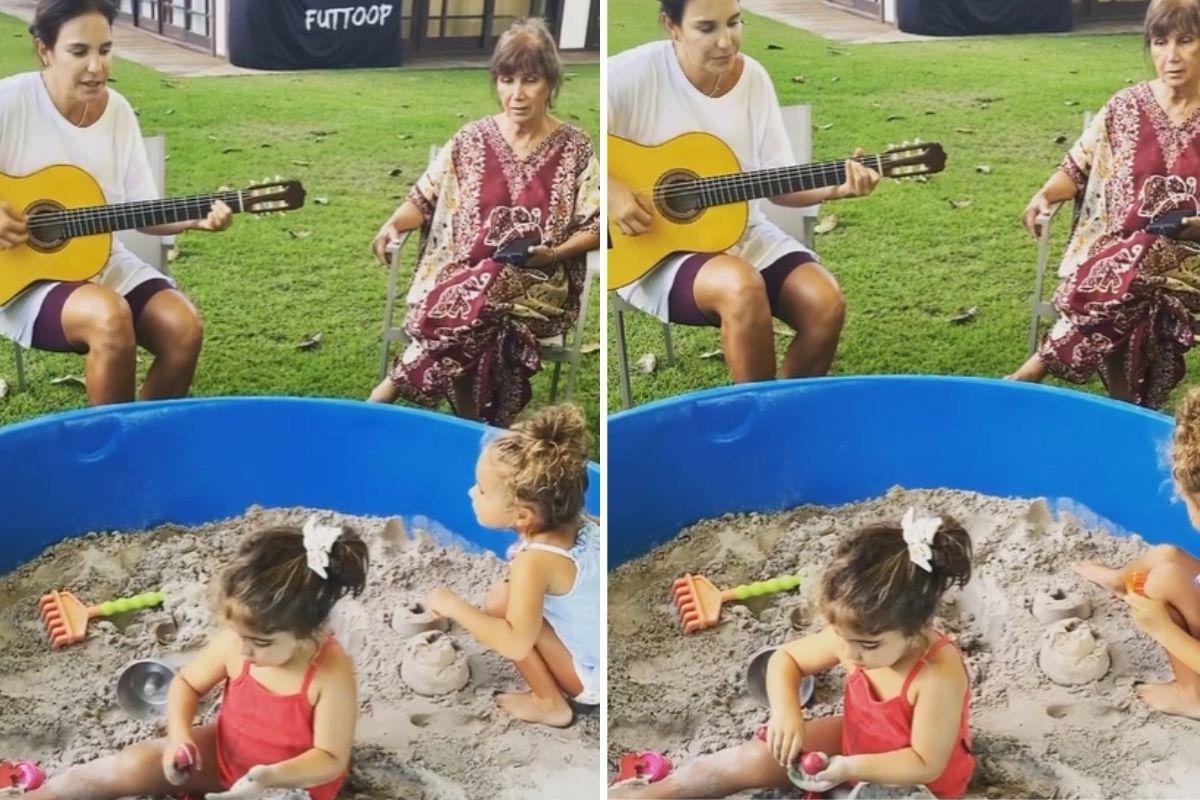 Ivete Sangalo encantou os seguidores na tarde desta quarta-feira, 6 de janeiro, ao publicar um momento super gostoso em família. A cantora mostrou nas redes sociais o momento em que tocava violão ao lado da mãe, Sônia, e das filhas, Marina e Helena, antes de ser interrompida pelo sistema de irrigação automático do jardim.