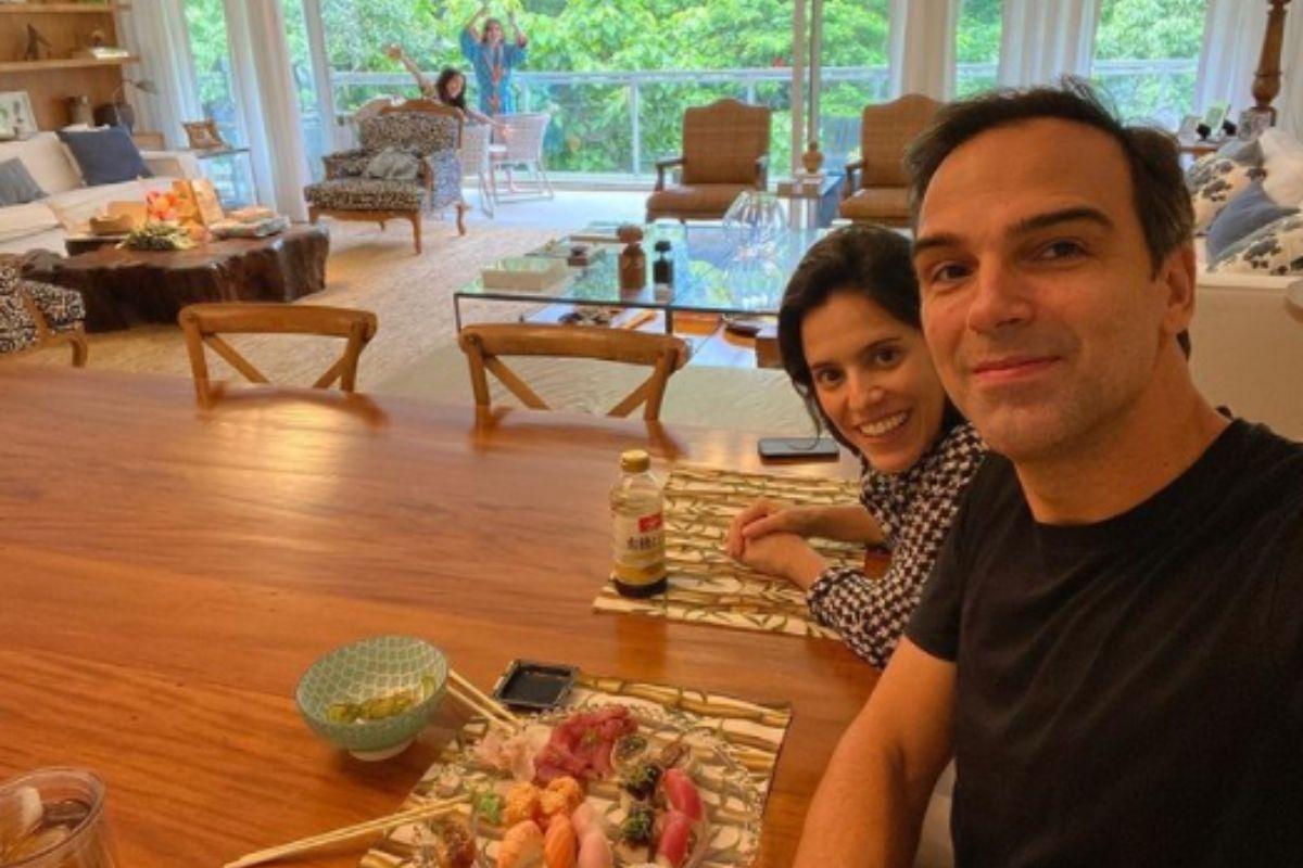 No registro as filhas aparecem na sacada, sendo separadas por um vidro. E Tadeu está ao lado da esposa, Ana Cristina, comendo comida japonesa.