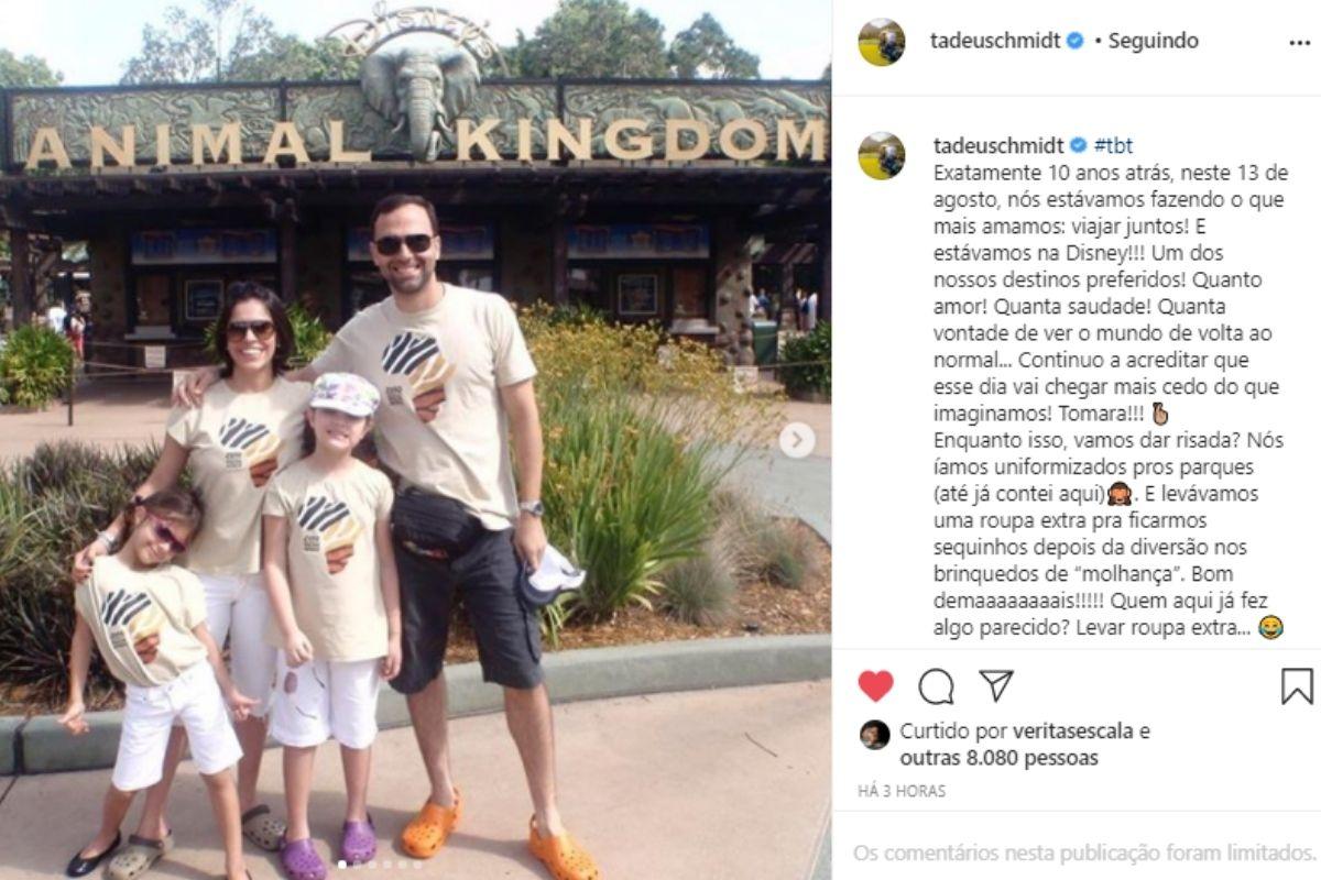 O jornalista e apresentador Tadeu Schmidt usou as redes sociais para compartilhar uma lembrança pra lá de especial ao lado da família. O famoso publicou uma foto da primeira viagem com os filhos e a esposa para Disney. Junto com a foto, Tadeu reviveu memórias da viagem e falou um pouco sobre a saudade desses momentos.