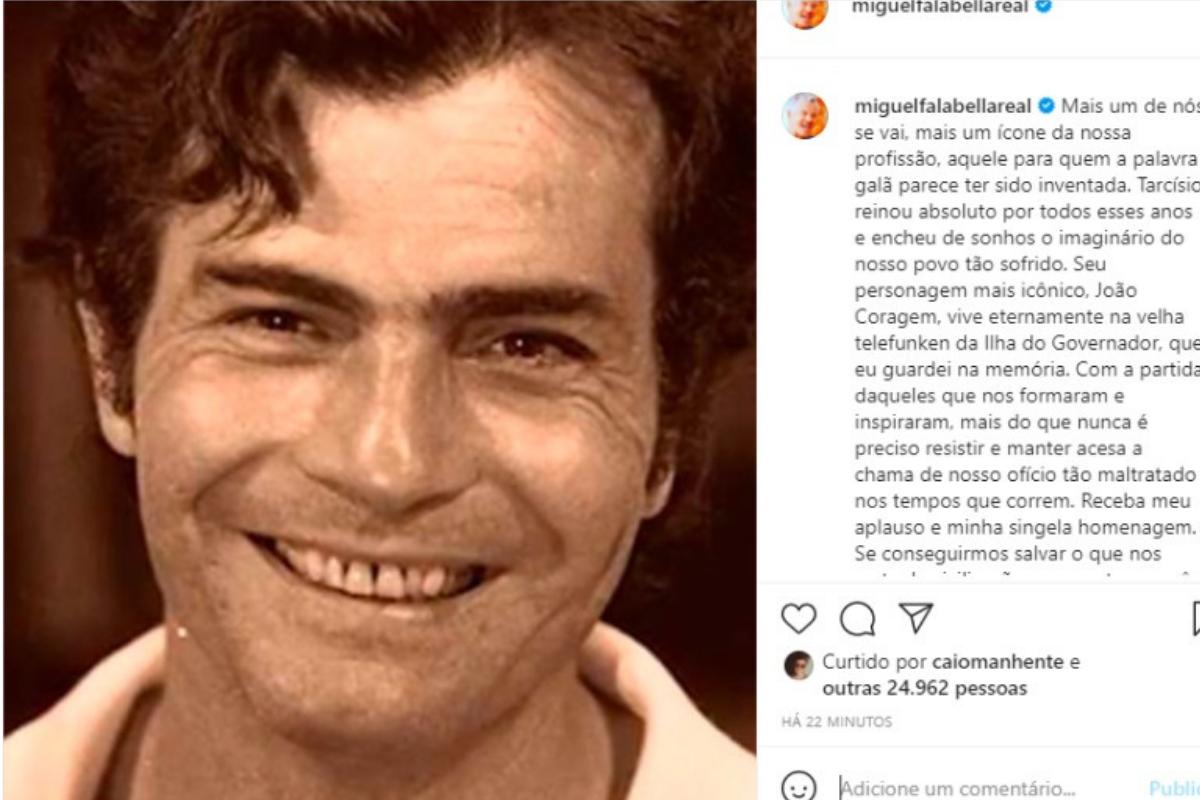 O ator e amigo de Tarcísio fez um texto para homenageá-lo e relembrar os personagens memoráveis que o ator já interpretou. “Mais um de nós se vai, mais um ícone da nossa profissão, aquele para quem a palavra galã parece ter sido inventada. Tarcísio reinou absoluto por todos esses anos e encheu de sonhos o imaginário do nosso povo tão sofrido. Seu personagem mais icônico, João Coragem, vive eternamente na velha telefunken da Ilha do Governador, que eu guardei na memória. Com a partida daqueles que nos formaram e inspiraram, mais do que nunca é preciso resistir e manter acesa a chama de nosso ofício tão maltratado nos tempos que correm. Receba meu aplauso e minha singela homenagem. Se conseguirmos salvar o que nos resta de civilização, com certeza você será sempre lembrado! Um beijo carinhoso.”, desabafou Miguel.