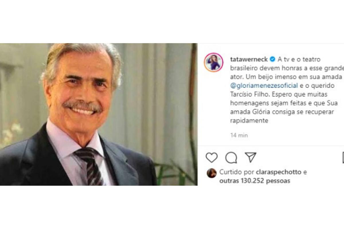 A humorista também falou sobre o assunto no Instagram. “A tv e o teatro brasileiro devem honras a esse grande ator. Um beijo imenso em sua amada @gloriamenezesoficial e o querido Tarcísio Filho. Espero que muitas homenagens sejam feitas e que Sua amada Glória consiga se recuperar rapidamente”, disse .