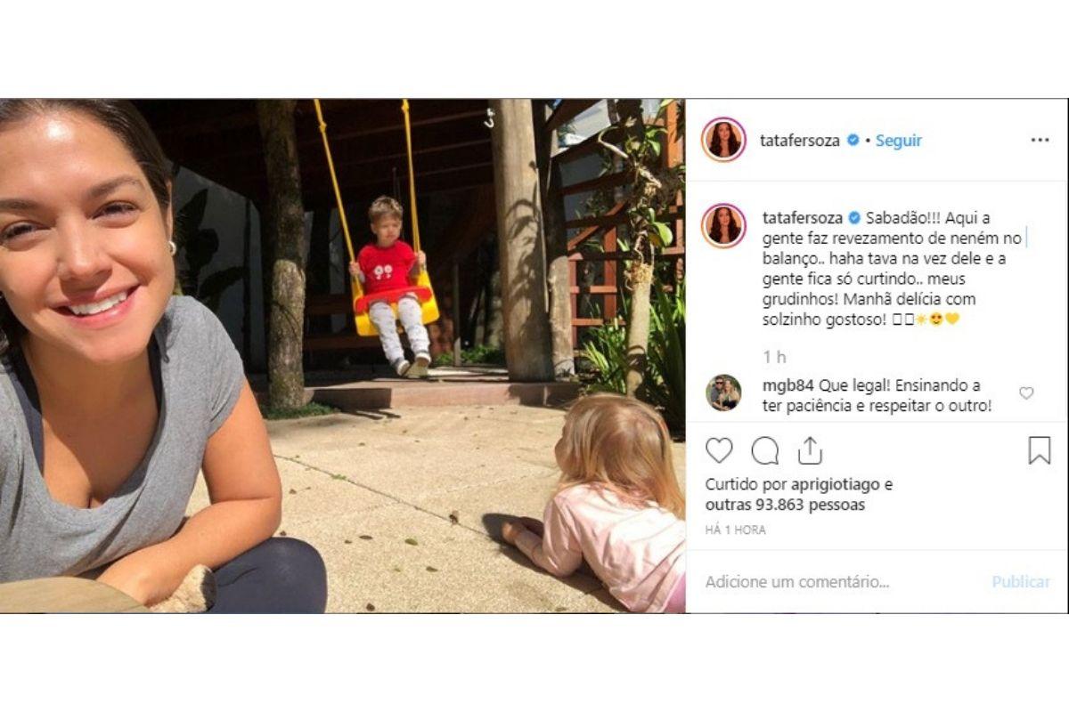 Tata sempre aproveita o tempo livre para curtir os filhos e brincar com eles. Em um sábado de sol, ela juntou os dois para se divertirem em um balanço e compartilhou o momento íntimo com seus seguidores.