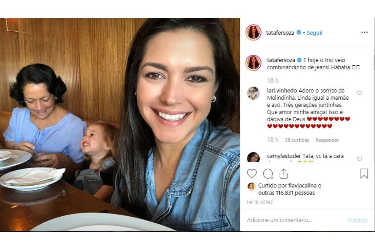 Na legenda, Tatá escreveu: “Hoje o trio veio combinandinho de jeans!” e foi muito elogiada pelos seguidores nos comentários da publicação. Alguns seguidores ainda falaram sobre a semelhança dela com a mãe: “Você está a cara dela!”