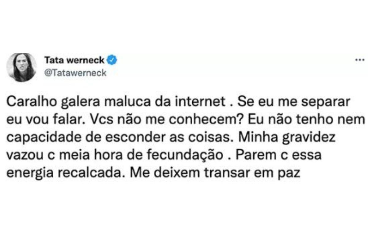 “Car**** galera malucada internet. Se eu me separar, vou falar. Vocês não me conhecem? Eu não tenho nem capacidade de esconder as coisas. Minha gravidez vazou com meia hora de fecundação. Parem com essa energia recalcada. Me deixem transar em paz”, disse ela no tuíte.
