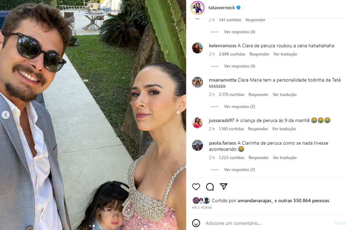 Os internautas e fãs da família fizeram vários elogios. “A Clarinha de peruca como se nada tivesse acontecendo”, disse um seguidor. “Eu já ia comentar: “nossa, como o cabelo da Clara está grande e escuro”, depois fui ver que era uma peruca”, escreveu outra pessoa. “Clara Maria tem a personalidade todinha da Tatá”, afirmou outro.