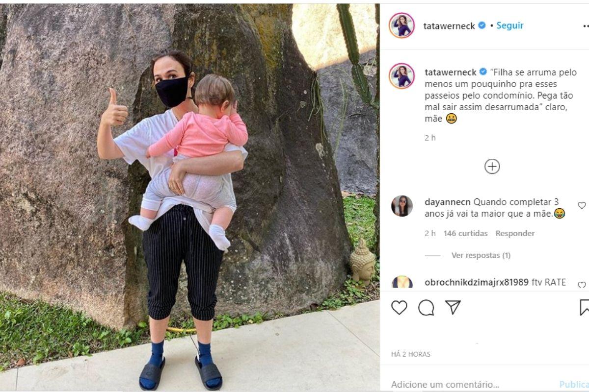 Na manhã desta segunda-feira, 31 de agosto, Tatá Werneck disse que não tem saído de casa, exceto para caminhar pelo condomínio em que mora no Rio de Janeiro. Apresentadora publicou um post no Instagram, com bom humor ao compartilhar o look “descontraído” que escolheu para o passeio com Clara Maria.