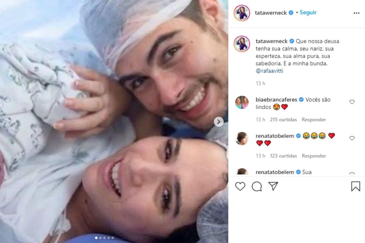 Em outra foto, dessa vez uma da família logo após o parto de Claria Maria, há um ano, Tatá listou várias qualidades de Rafael que espera passar para a filha. “Que nossa deusa tenha sua calma, seu nariz, sua esperteza, sua alma pura, sua sabedoria”, desejou a mãe. E claro, para terminar de maneira descontraída, a humorista completou: “E a minha bunda”.