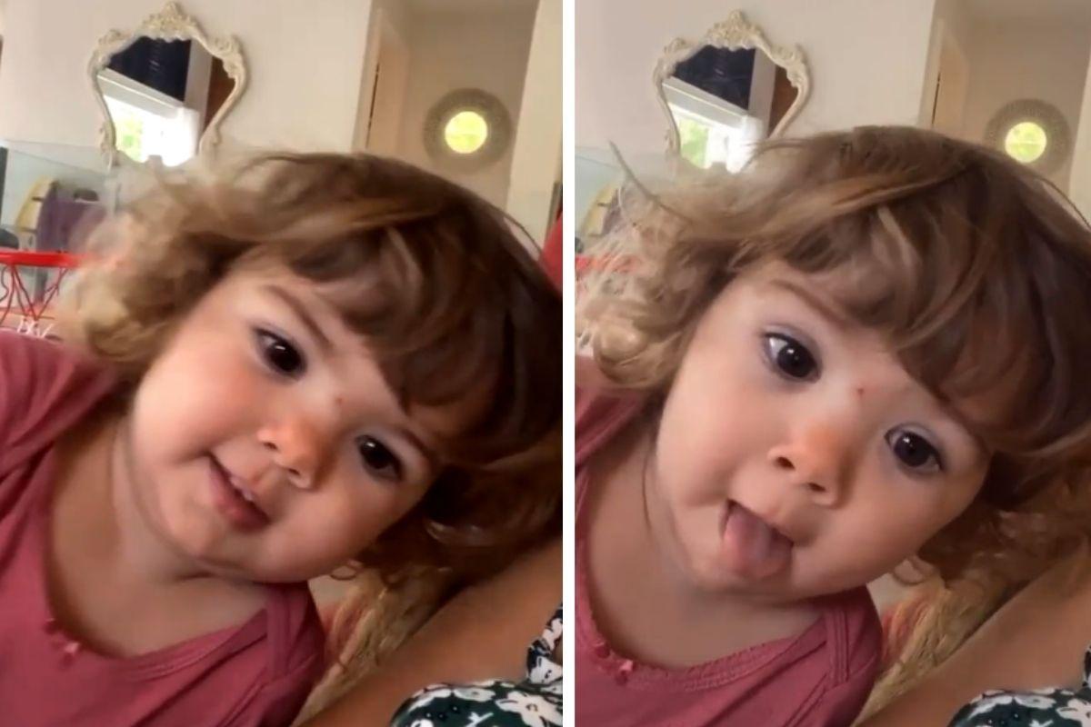 “Cadê o sorriso?”, pergunta Tatá ao virar a câmera, de forma na qual Claria Maria conseguisse se ver. A bebê, então, mostra que já é cheia de personalidade e, ao invés de sorrir, mostra a língua e faz careta para a câmera!