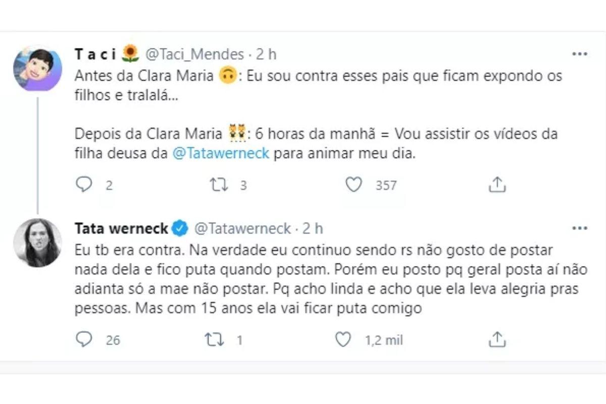 Tatá Werneck tocou em um assunto controverso nesta sexta-feira, 5 de março, ao falar que era contra pais que expunham os filhos nas redes sociais. A humorista, que frequentemente publica fotos e vídeos de Clara Maria, de 1 ano, assim como o companheiro, Rafa Vitti, explicou o que a fez mudar de opinião depois de ser questionada por uma seguidora do Twitter.