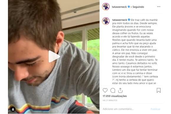 “Ele traz café da manhã pra mim todos os dias. Desde sempre. Ele planta árvores e se emociona imaginando quando for com nossa deusa colher os frutos. Eu às vezes acordo e ele tá fazendo aquelas flexões que quando levanta bate uma palma e acha fofo que eu peço ajuda pra levantar que tá me atacando o ciático. Ele me ensinou a viver em paz. A amar em paz. Não consegui desgrudar de você desde o primeiro dia. E tentei muito. Te admiro tanto. Te amo tanto. Casamos deitados no sofá. Nosso sossego é estarmos juntos. Lembro um dia que fui tentar terminar com você e você tirou a camisa e disse (com ironia obviamente): “Tem certeza?”. Hoje tenho a certeza de que quero estar do seu lado meu amor e que se eu tirar a camisa meu peito vai tá vazando. Te amo. Parabéns. Deus Abençoe nossa família e nosso amor. @rafaavitti“, escreveu na legenda.