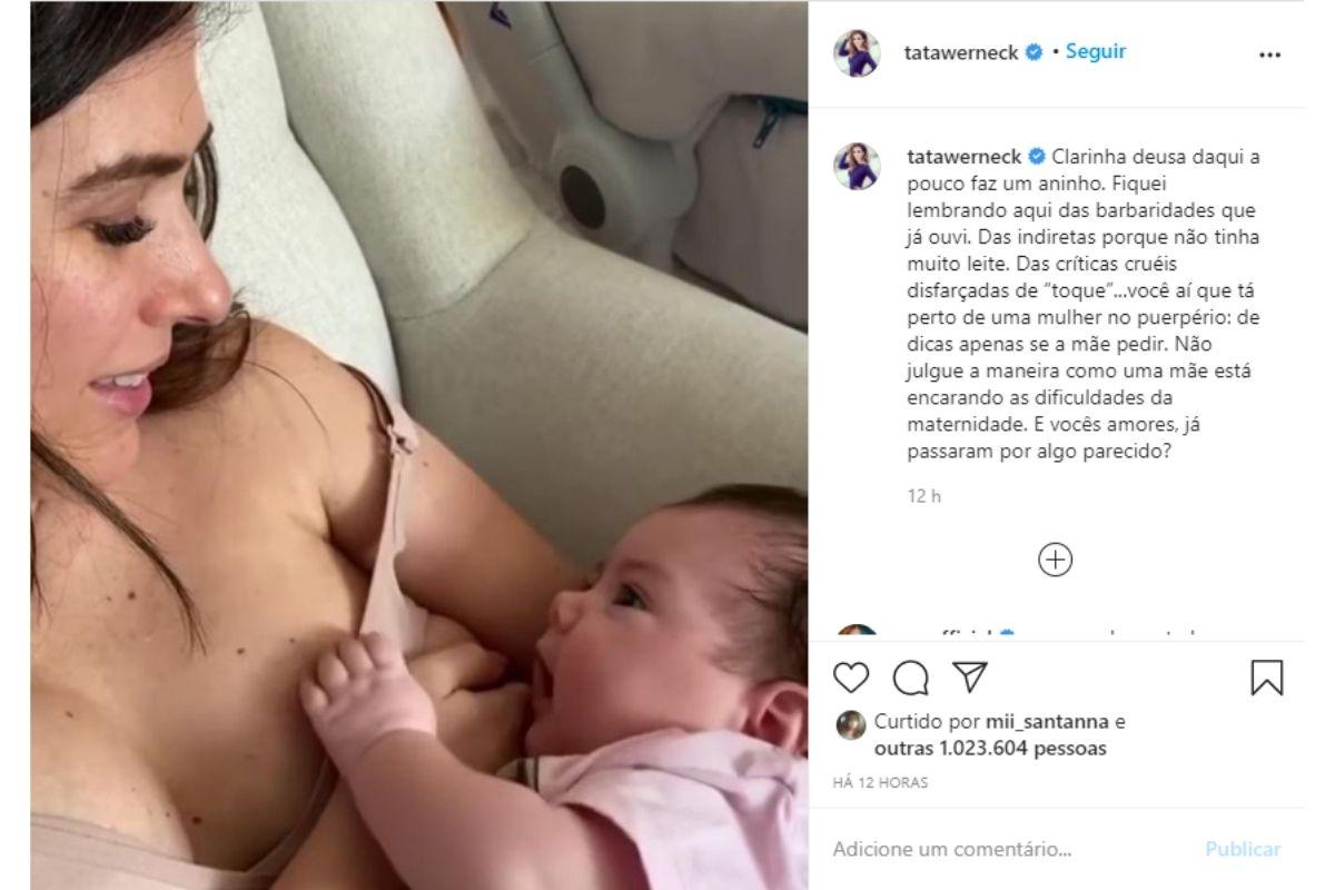 Na imagem, Tatá aparece amamentando a filha, Maria Clara, fruto do relacionamento com o ator Rafael Vitti. “Clarinha deusa daqui a pouco faz um aninho. Fiquei lembrando aqui das barbaridades que já ouvi. Das indiretas porque não tinha muito leite. Das críticas cruéis disfarçadas de “toque””, desabafou.