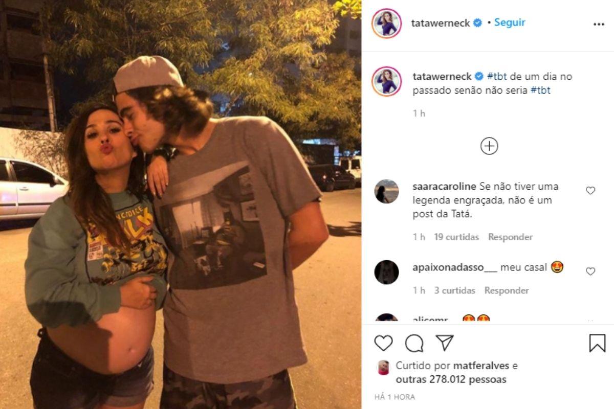 Na foto compartilhada no Instagram, a apresentadora aparece ao lado do ator, exibindo o barrigão de grávida e recebendo um carinho do marido, que encostava o rosto na bochecha de Tatá. Com uma legenda bem-humorada (como sempre!), Tatá escreveu:”#Tbt de um dia no passado senão não seria #tbt”, brincou.