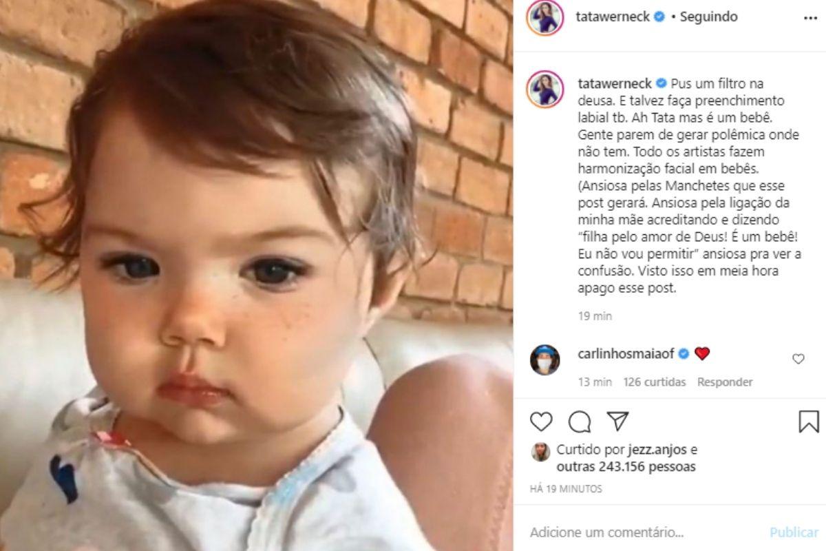 “Pus um filtro na deusa. E talvez faça preenchimento labial tb. Ah Tata mas é um bebê. Gente parem de gerar polêmica onde não tem. Todo os artistas fazem harmonização facial em bebês”, começou escrevendo. “(Ansiosa pelas Manchetes que esse post gerará. Ansiosa pela ligação da minha mãe acreditando e dizendo “filha pelo amor de Deus! É um bebê! Eu não vou permitir” ansiosa pra ver a confusão. Visto isso em meia hora apago esse post”, continuou, brincando.