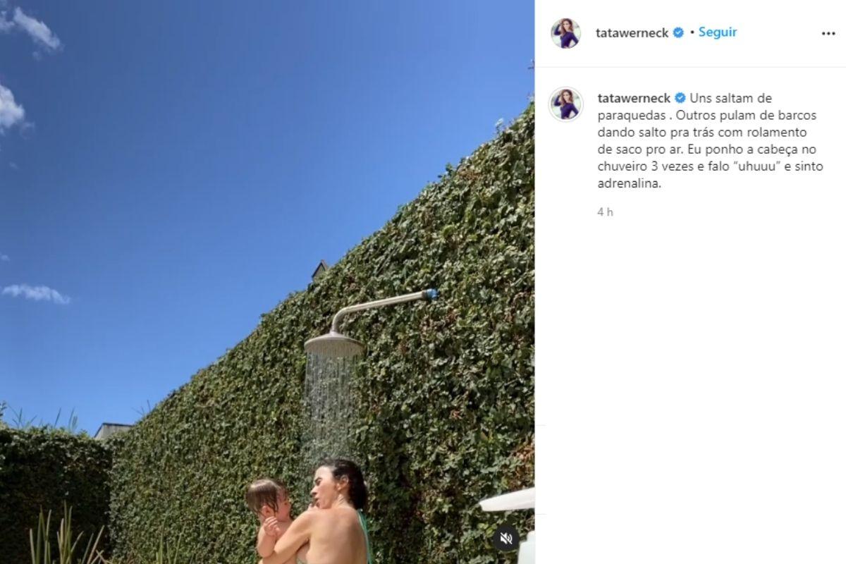 No vídeo, Tatá segura a bebê de 1 ano enquanto dá umas entradas rápidas de baixo da ducha. “Uns saltam de paraquedas . Outros pulam de barcos dando salto para trás com rolamento de saco pro ar. Eu ponho a cabeça no chuveiro 3 vezes e falo “uhuuu” e sinto adrenalina”, escreveu a mãe na legenda da publicação.