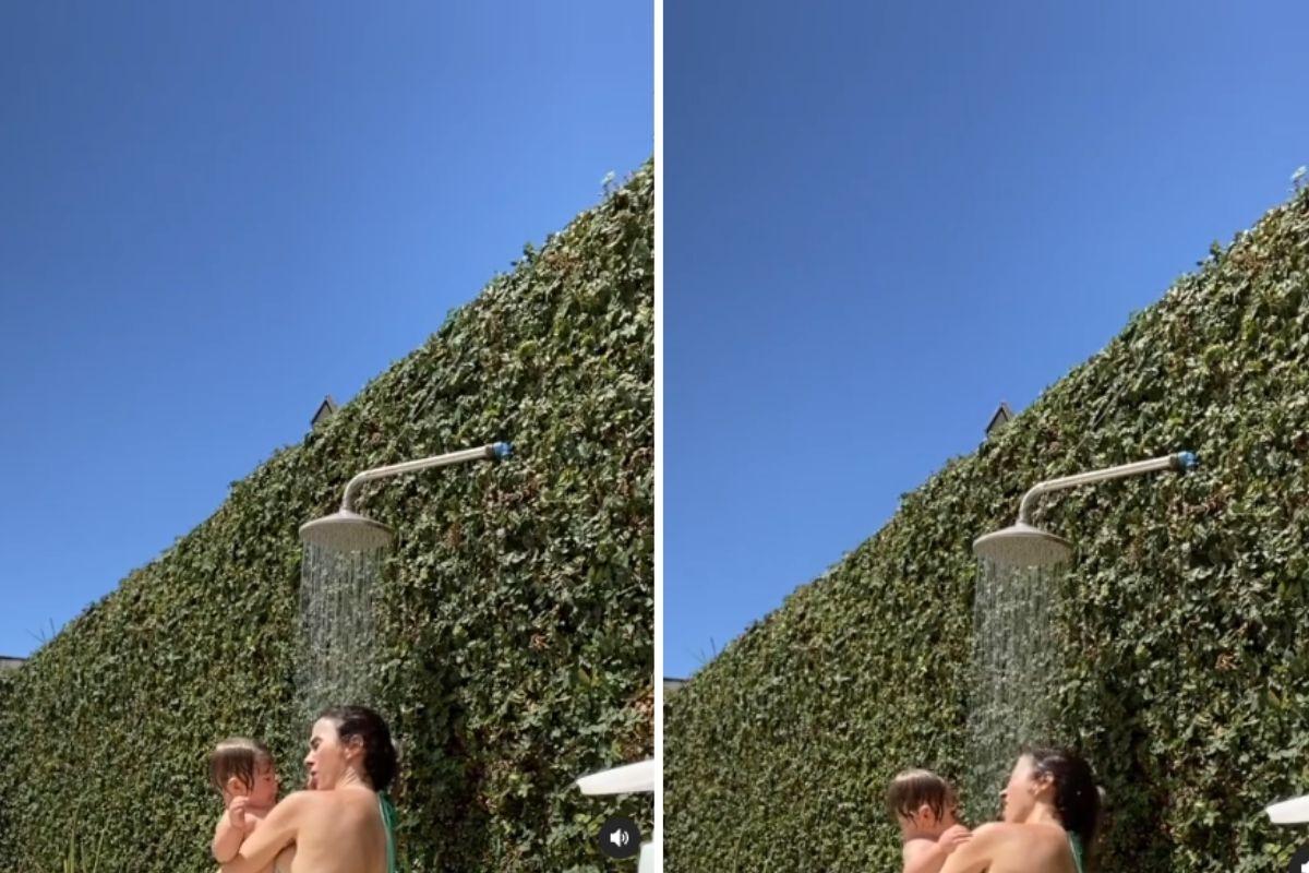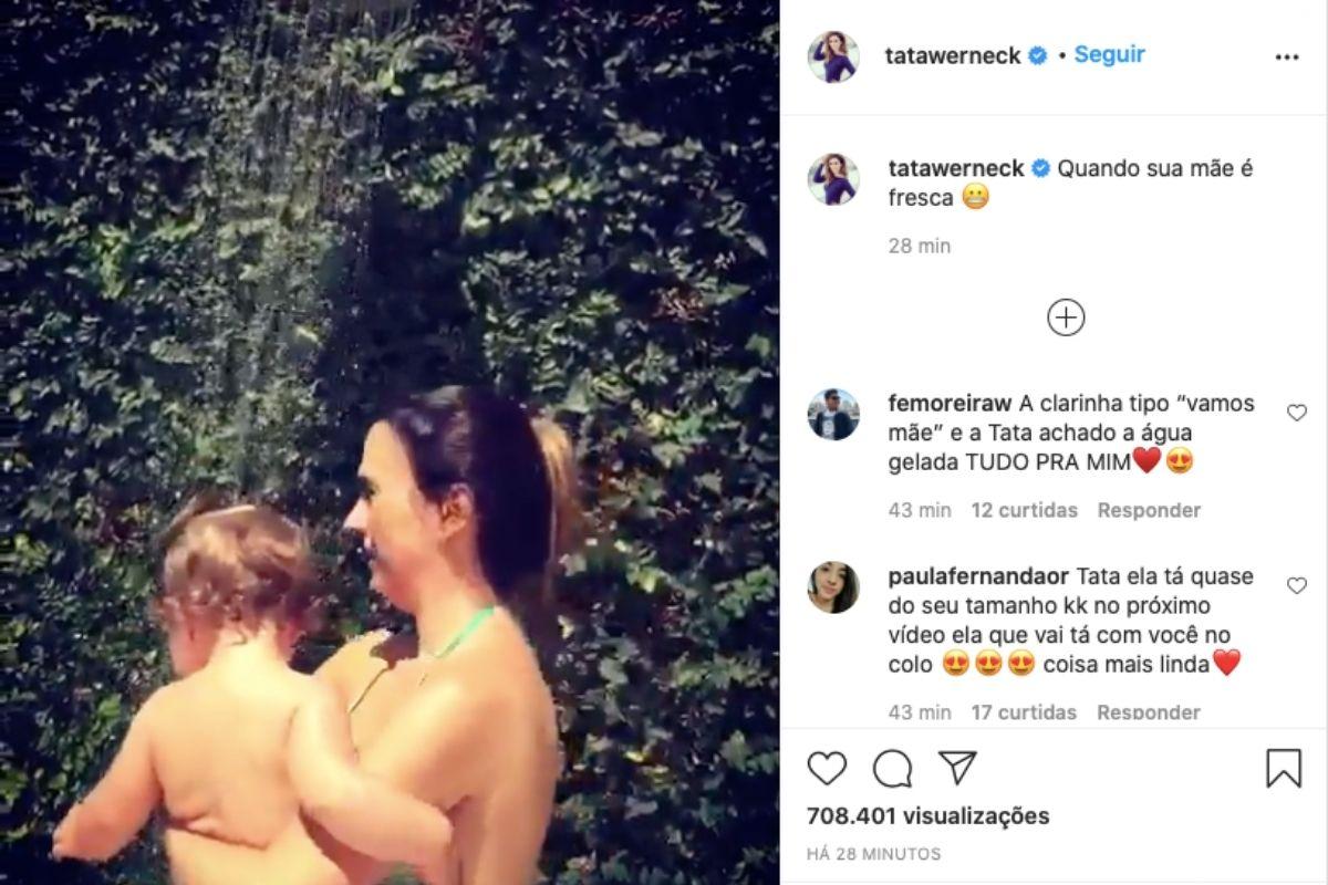 Mais cedo, Tatá já tinha publicado um vídeo semelhante.Nas imagens, a apresentadora está aproveitando o dia quente com Clara Maria e as duas estão prestes a entrar em uma ducha de piscina, no entanto quando a mãe sente a temperatura da água desiste.