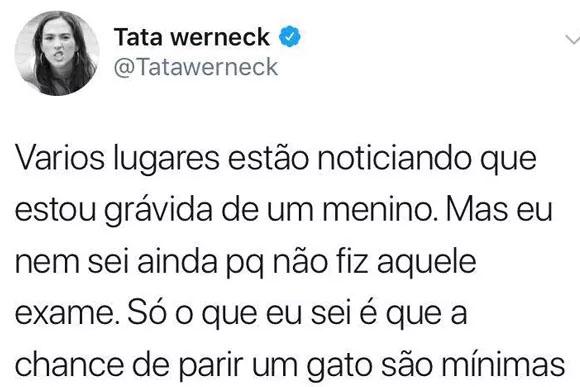 Nas últimas semanas, vários sites noticiaram que Tatá Werneck estaria esperando um menino, mas ela desmentiu da maneira que só ela sabe fazer! Pelo site, ela escreveu “Vários lugares estão noticiando que estou grávida de um menino. Mas eu nem sei ainda porque não fiz aquele exame. Só o que eu sei é que a chance de parir um gato são mínimas”, brincou. Uma seguidora aproveitou o bom-humor e afirmou “Que nada! Você é uma gata!”. O que não é mentira, né?
