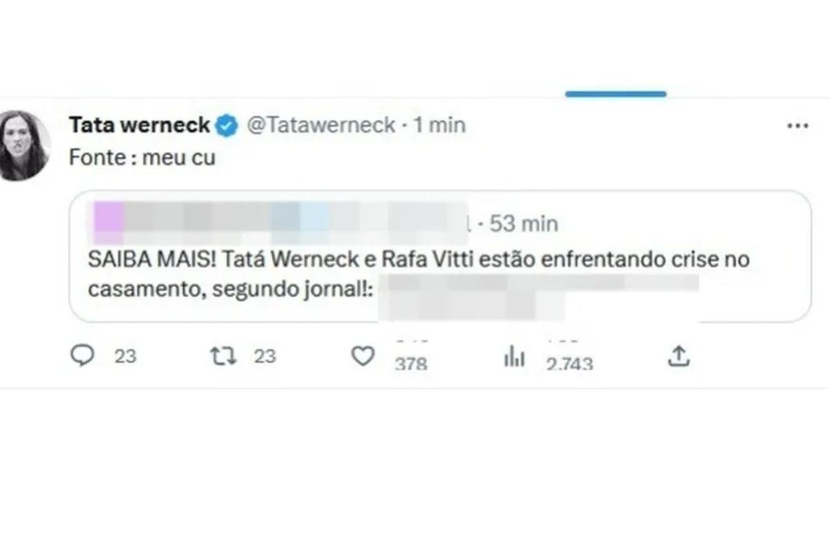 Nesta quarta-feira, dia 05 de abril, a atriz Tatá Werneck, de 39 anos, se pronunciou após rumores de uma possível separação com Rafa Vitti, de 27 anos. No Twitter ela compartilhou o link de uma matéria que fala que o casal havia terminado o relacionamento e respondeu: “Fonte: meu c*”.
