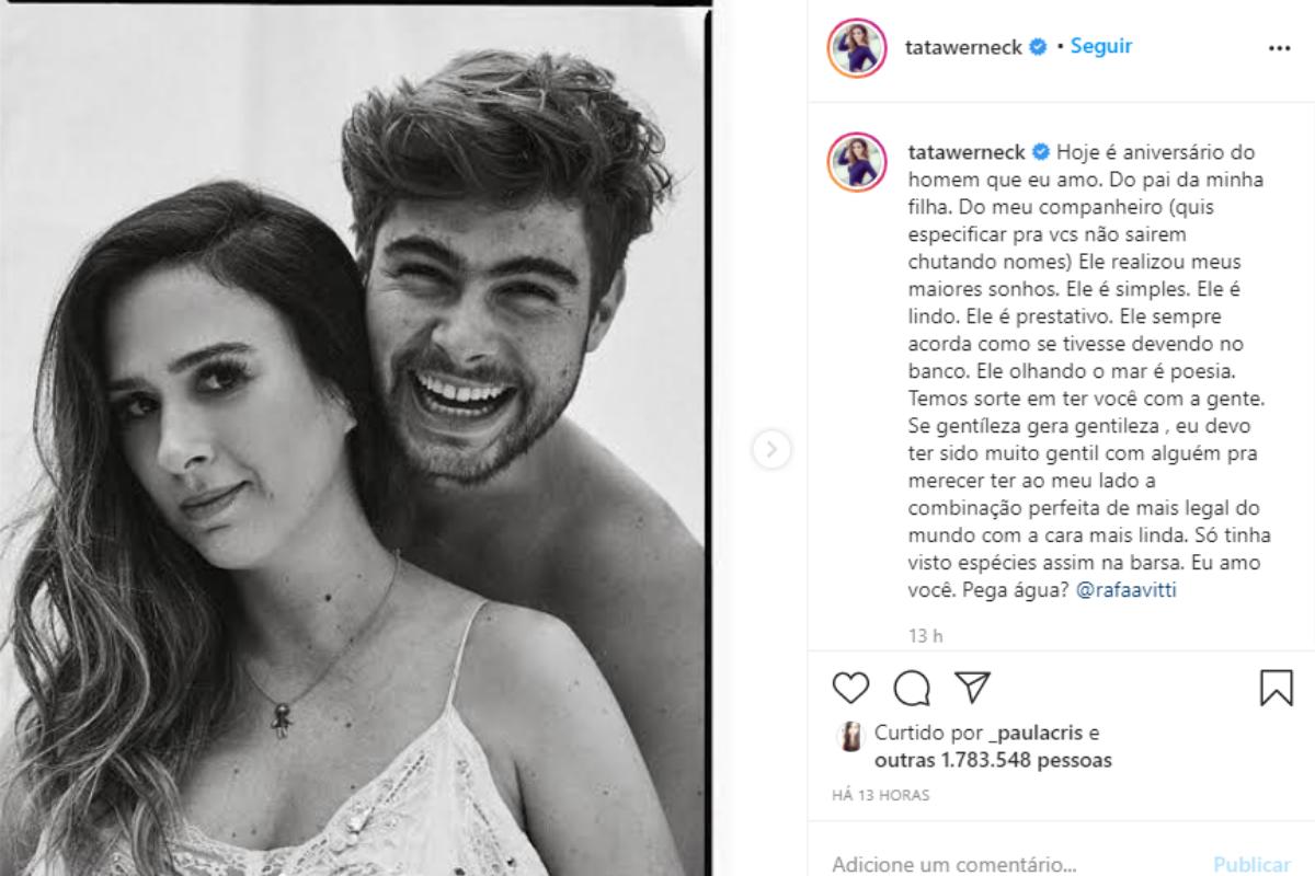 Nos comentários, seguidores não dispensaram os elogios ao casal. “Chorei com essa foto”, escreveu um. Rafael Vitti também deixou um comentário no post, definindo os dois como “maduros”. “Se não tiver uma legenda engraçada, não é um post da Tatá”, brincou uma internauta.