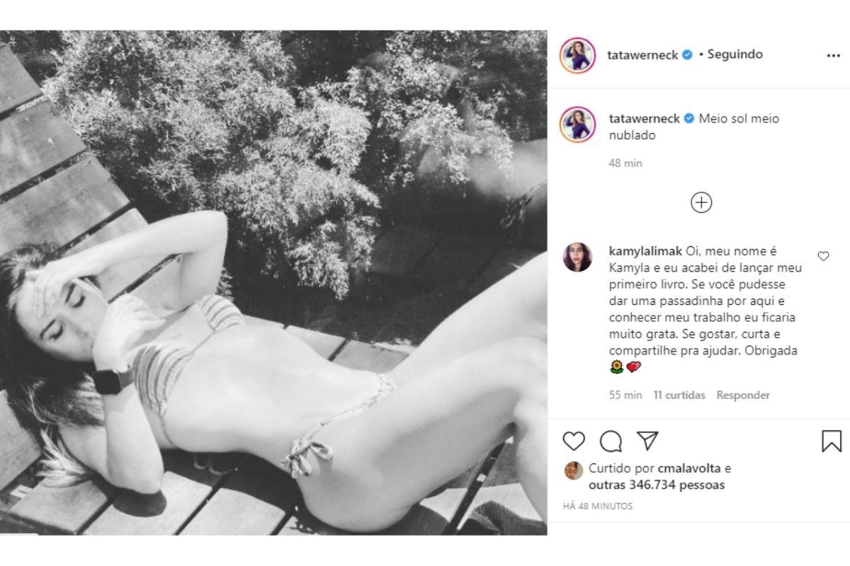 A apresentadora Tatá Werneck usou as redes sociais nesta quarta-feira, 20 de janeiro, para compartilhar uma foto em que aparece de biquíni tomando sol. “Meio sol meio nublado”, escreveu a mãe ao publicar a imagem no Instagram. Na imagem, a famosa mostrou o corpo 1 ano e 3 meses após dar à luz e chamou a atenção dos internautas.