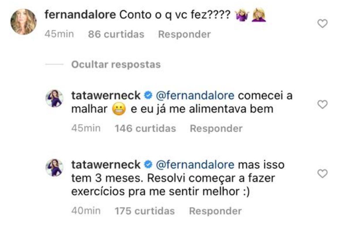 Nos comentários, diversos seguidores questionaram sobre a rotina depois do parto e como ela fez para conseguir voltar ao corpo que tinha. Tatá respondeu algumas perguntas. “Como você fez??”, perguntou uma internauta. “Comecei a malhar e eu já me alimentava bem”, respondeu a famosa. “Mas isso tem três meses, comecei a fazer exercício para me sentir melhor”, completou a humorista.