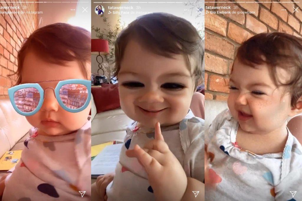 Testando alguns filtros, a apresentadora fez até a bebê rir. Primeiro ela colocou o filtro de óculos: “É você, pequenininha!”. Após a bebê fazer “não” com o dedo, ela pergunta: “Não é você?”. Basta Tatá falar sobre a lua, que a bebê olha para cima, o que a mãe completa: “Está no céu”.