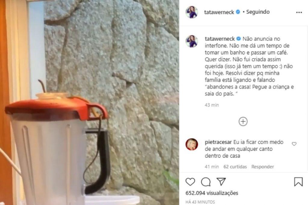 Mais cedo nesta semana, Tatá compartilhou um vídeo de uma cobra que entrou na casa onde ela mora. “Querida isso á um liquidificador, uma coisa importada, a gente tem todo um esquema aqui de manuseio. A senhora, por gentileza. Não sei se a senhora veio com um primo, não sei como que tá. A gente está em uma pandemia e estamos pedindo um pouquinho de respeito da senhora”, brincou Tatá na legenda.