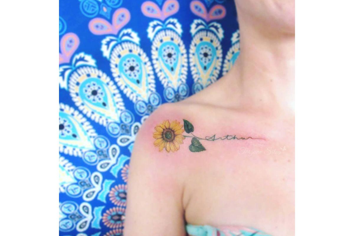 Outra opção que segue a mesma linha de raciocínio da última inspiração é usar um girassol. Assim, a tatuagem fica mais colorida e chama mais atenção. A fonte usada para escrever o nome é um pouco mais alongada e chamativa, mas ainda assim mantem a delicadeza do traço.