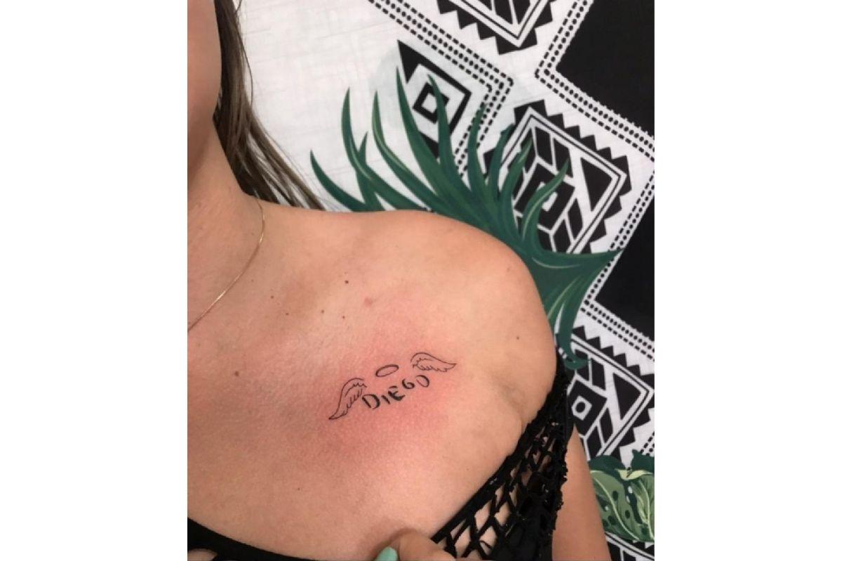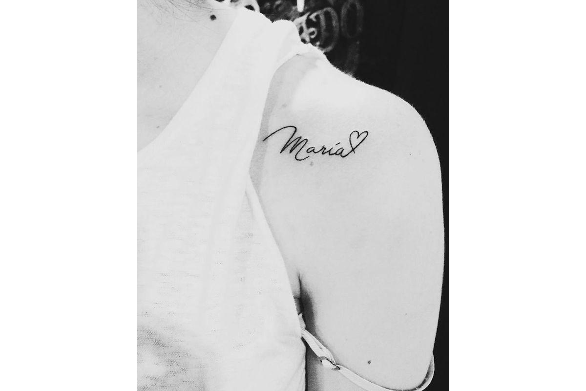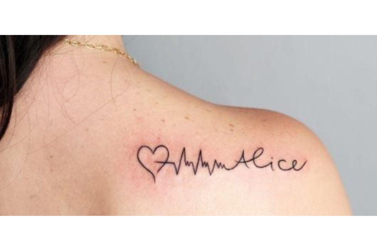 Outro clássico de tatuagens é o desenho de batimento cardíaco, símbolo da vida. Aqui, as linhas com altos e baixos, adornadas por um coração, antecedem o nome da filha escrito em letra cursiva e fina, bastante descontraída. Ela também fica na parte de trás dos ombros, sendo bem mais discreta.