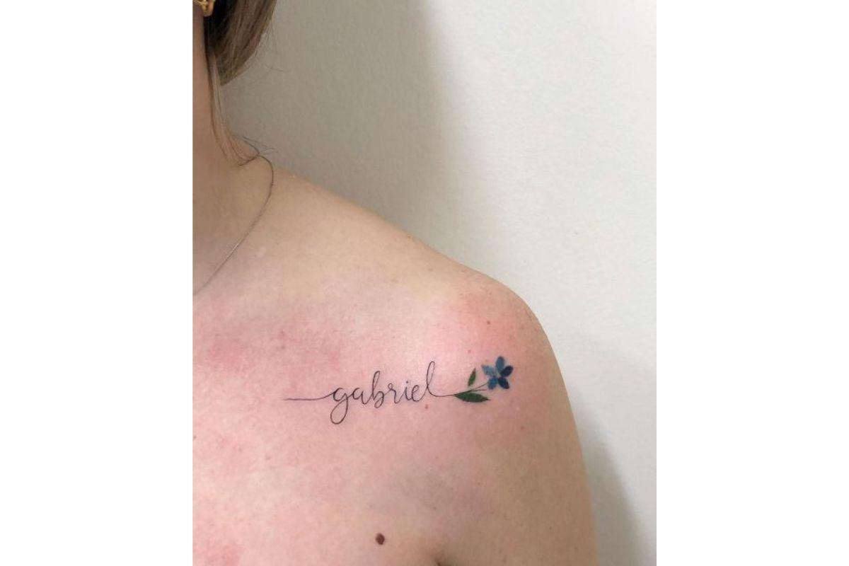 O traço mais fino deixa qualquer tatuagem mais delicada e discreta. Você pode aproveitar o traço cursivo do nome do seu filho e puxar um desenho, como folhas, flores ou outro item que te agrade e simbolize algo especial. Aqui, a flor azul arrematou a tattoo e deu uma carinha mais sofisticada.