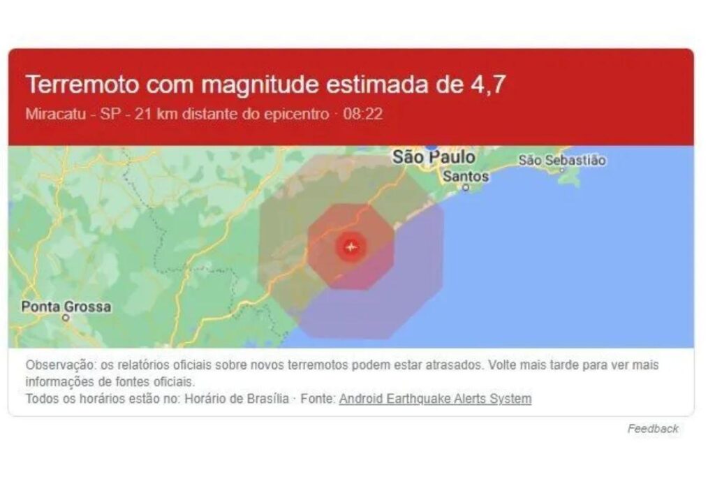 O Google também emitiu um alerta de terremoto com magnitude estimada de 4,7 para a cidade de Miracatu. Nas redes sociais, circulam imagens de câmeras de segurança que mostram o momento do tremor de terra.