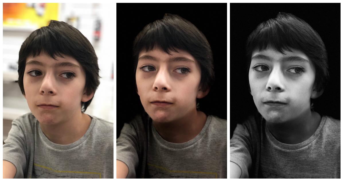 Outro ponto interessante e certeiro para quem tira foto dos filhos dia sim, dia sim e adora ir em shows é a nova câmera do aparelho. Nós sabemos que boa parte das suas imagens saem borradas e sem forma, no caso de crianças correndo, ou sem luz e nitidez, no caso de espetáculos noturnos. Para isso, a câmera do iPhone 8 tem uma abertura maior e uma estabilidade que capta bem melhor imagens em movimento. A abertura maior funciona para ambientes com pouca luz. Já, o modo retrato, que desfoca o fundo, resultado das duas câmeras funcionando juntas e só encontrado no 8 Plus vem com mais recursos. É possível transformar as fotos em cinco modos. Os três mais legais com o meu filho Teodoro, eu mostro abaixo. A câmera traseira continua com seus 12 MP e a dianteira para selfies com 7 MP – e também uma melhor abertura para captar pontos mais escuros.