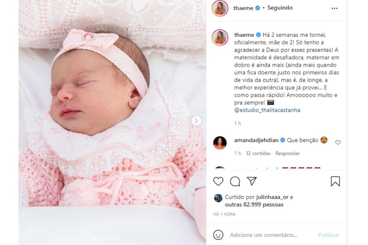 A cantora Thaeme Mariôto, da dupla com Thiago, usou as redes sociais nesta quarta-feira, 6 de outubro, para compartilhar uma declaração para a filha, Ivy, que completou 2 semanas de vida. Para fazer a homenagem, ela publicou uma foto da bebê. Thaeme também é mãe de Liz, de 2 anos.
