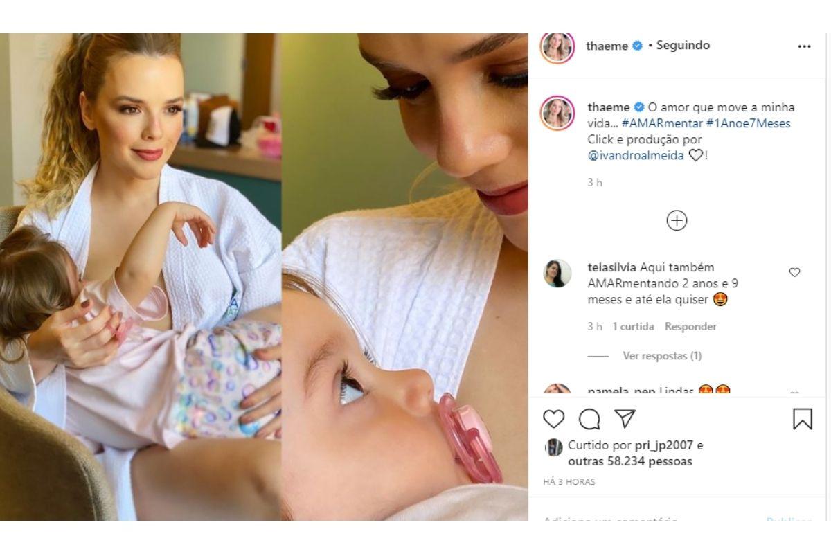 A cantora Thaeme Mariôto usou as redes sociais nesta segunda-feira, 14 de dezembro, para compartilhar uma montagem de fotos cheias de amor ao lado da filha, Liz, de 1 ano e 7 meses. Nas imagens, a garota aparece no colo da mãe logo após a amamentação. “O amor que move a minha vida… #AMARmentar #1Anoe7Meses”, escreveu ela ao mostrar os cliques.