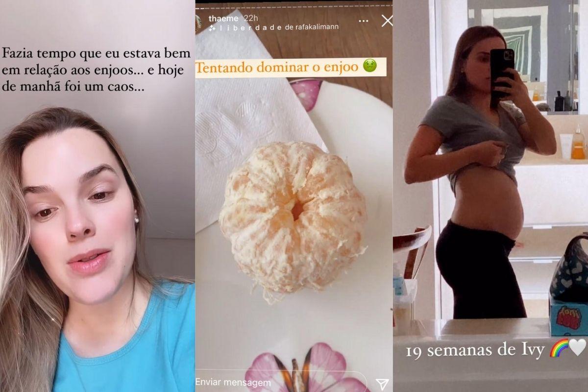 Na sequência ela mostra que está comendo Tangerina para ajudar com os sintomas. “Tentar dominar o enjoo”, escreveu na legenda. Em seguida ela mostra o tamanho da barriga, posando com uma blusa cinza e uma legging preta. “19 semanas de Ivy”, escreveu.