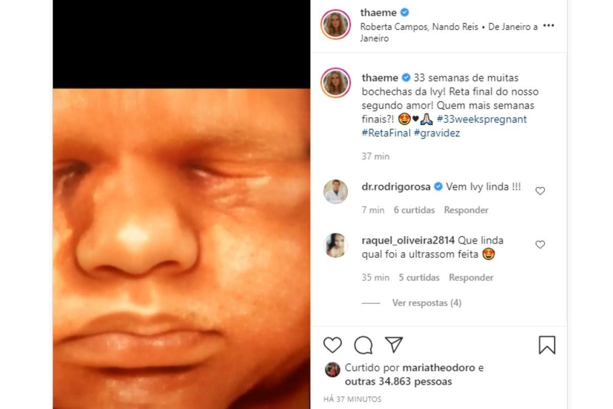 Rapidamente os fãs e amigos da família passaram a elogiar: “Lindeza”, disse um. “Muito amor”, falou outro.  Recentemente, Thaeme usou as redes sociais  para compartilhar um vídeo em que mostra o rosto da filha, Ivy, em um ultrassom 3D.