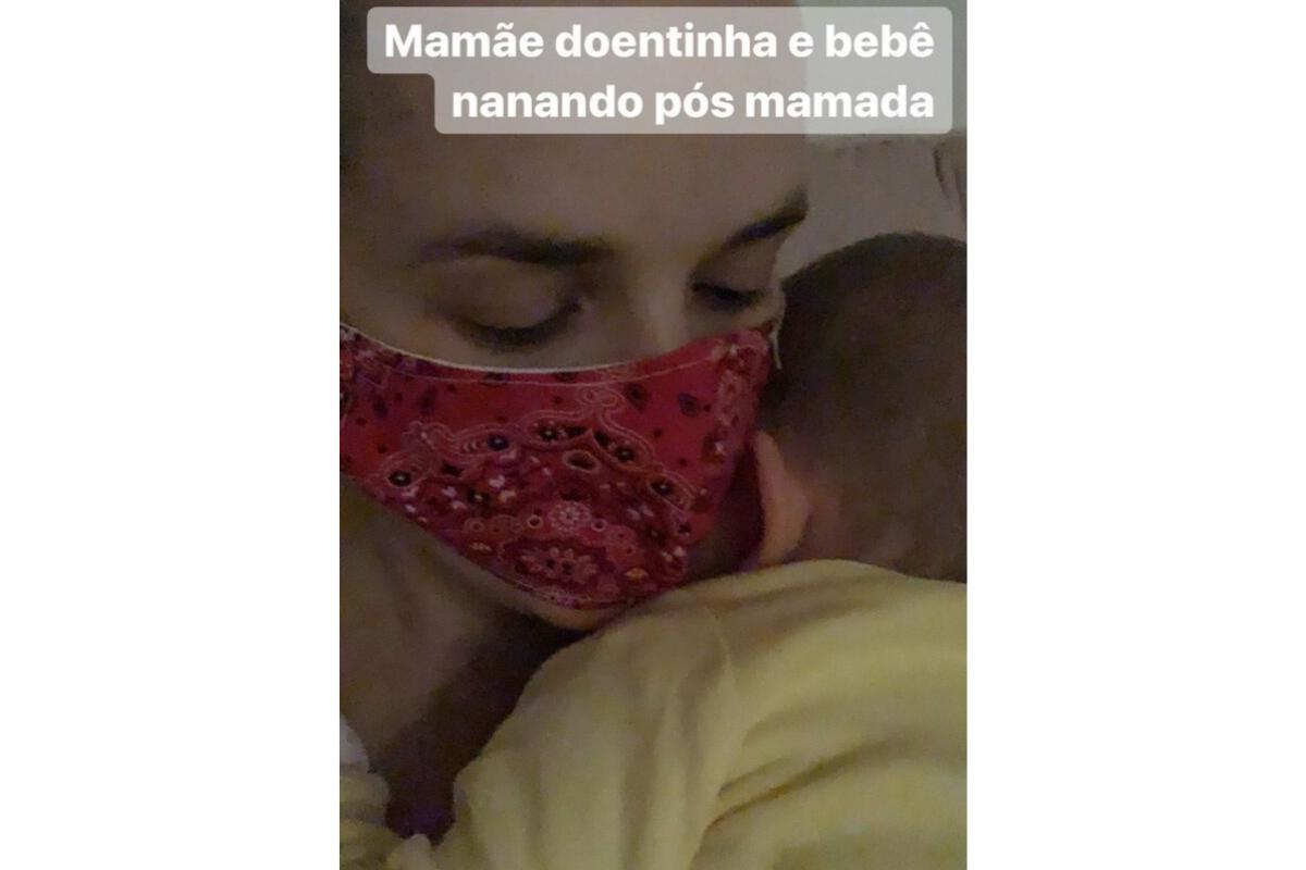 A cantora afirmou que estava doente e não queria passar para a bebê e por isso usou as máscaras. “Mamãe doentinha e bebê nanando após a mamada”, disse nas redes sociais, abraçada com a filha.